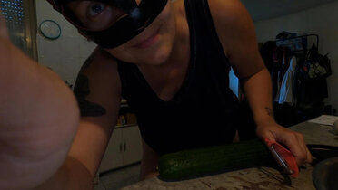 Hot French MILF Kahann masturbates with cucumber in kitchen close-up amateur video